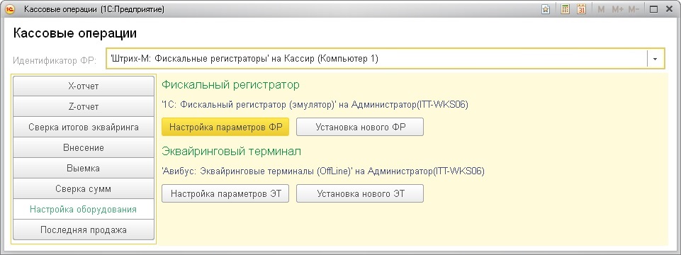 В справочнике Подключаемое оборудование создаются конфигурации рабочих мест. Запись в справочнике связывает конкретное рабочее место (пользователь, компьютер), конфигурацию оборудования и физический экземпляр оборудования, при этом один и тот же экземпляр, рабочее место, пользователь могут использоваться в нескольких записях.
