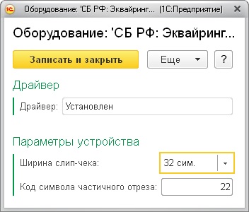 При настройке подключения эквайрингового терминала необходимо задать параметры Ширина слип-чека – ширина чека эквайрингового терминала, и Код символа частичного отреза – настройка печати двух чеков (фискального и нефискального) с частичным отрезом.