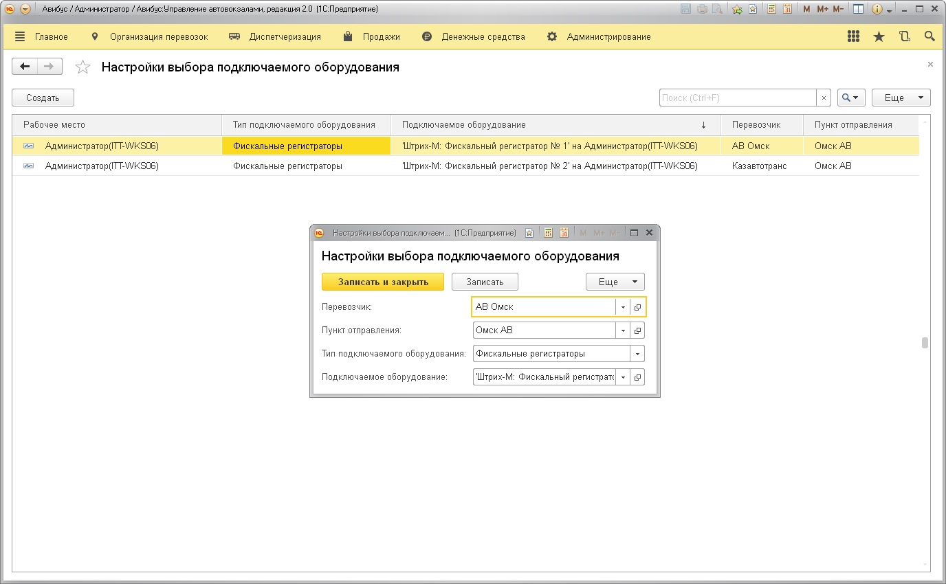 В этом разделе есть возможность настроить выбор подключаемого оборудования, если на одном рабочем месте используется несколько фискальных регистраторов в зависимости от условий: перевозчик и пункт отправления, например, если необходимо чтобы продажи для определенного перевозчика и пункта отправления фиксировались в указанной ККМ.