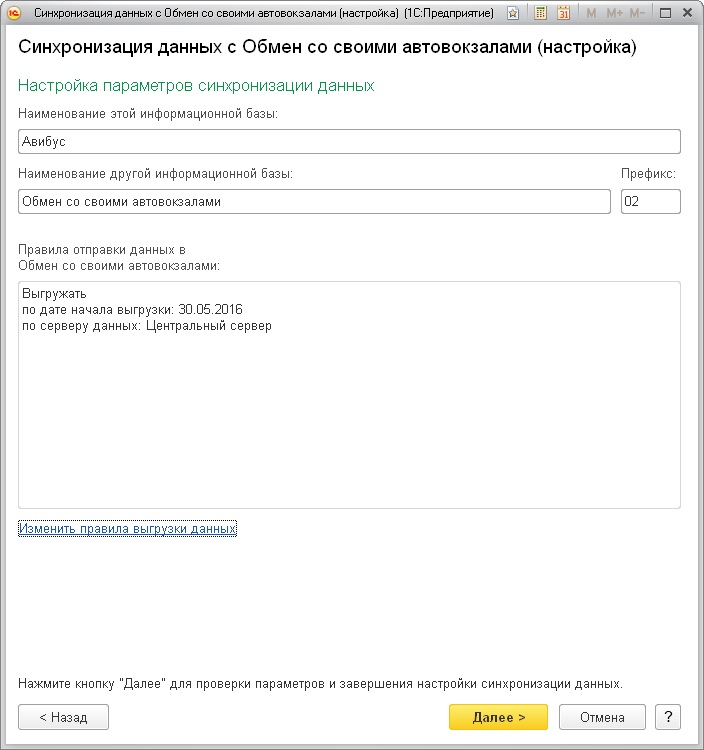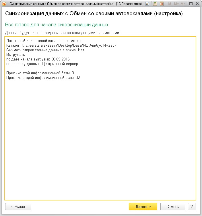 Для проверки указанных параметров синхронизации данных необходимо нажать на кнопку Далее.
