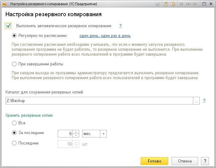 Резервное копирование может выполняться в автоматическом режиме. Включение автоматического режима, указание периодичности выполнения копирования, а также настройка хранения копий информационных баз доступно в разделе Администрирование – Поддержка и обслуживание – Резервное копирование и восстановление при нажатии на ссылку Настройка резервного копирования.