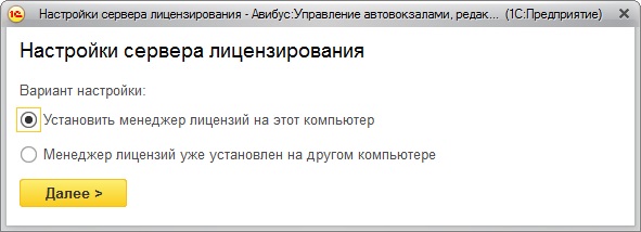 Если менеджер лицензий ранее не был установлен, необходимо выбрать пункт «Установить менеджер лицензий на этот компьютер» и нажать на кнопку Далее. Установка будет производиться локально. Для установки, пользователь должен обладать правами администратора. Для многопользовательских лицензий менеджер лицензий необходимо устанавливать на сервере.