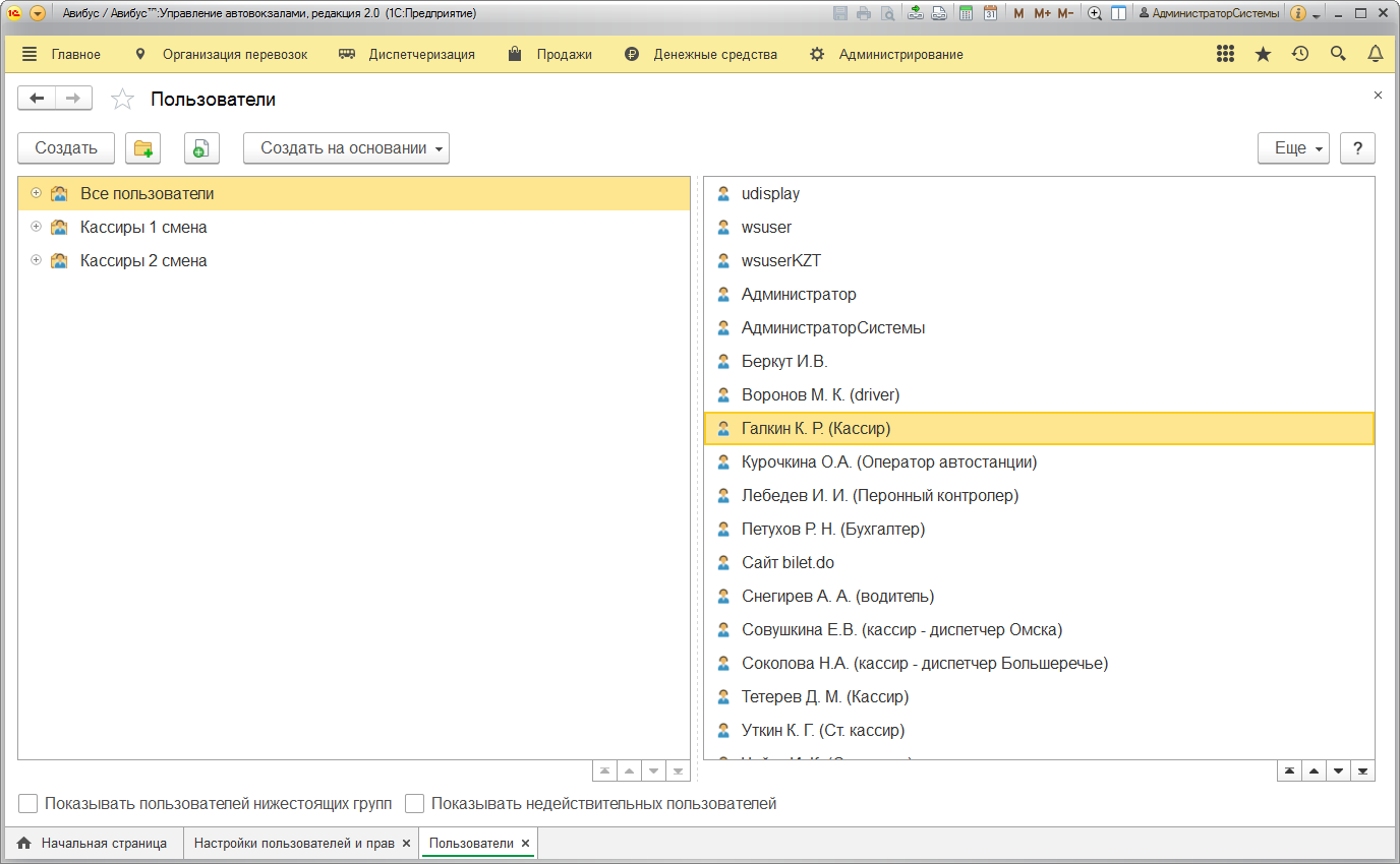 Запишите внесенные изменения, кликнув по кнопке Записать, и перейдите по ссылке к Правам доступа. Включите текущего пользователя в группы Кассиры и Диспетчеры.