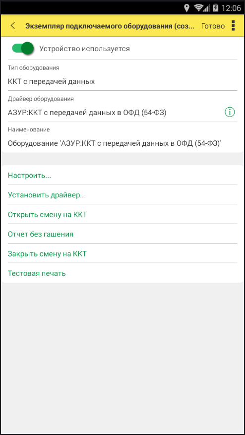 4. Установите переключатель в положение «Устройство используется». Укажите Тип оборудования , а в поле ниже укажите Драйвер оборудования . Поле Наименование заполниться автоматически. Например, если вы настраиваете приложение на мобильной кассе Azur Pos, создайте следующие типы оборудования: