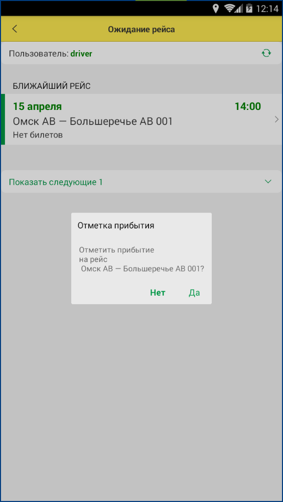 После установки этой отметки водитель увидит список проданных на рейс билетов, а в системе «Авибус» статус текущего рейса изменится на Прибыл.
