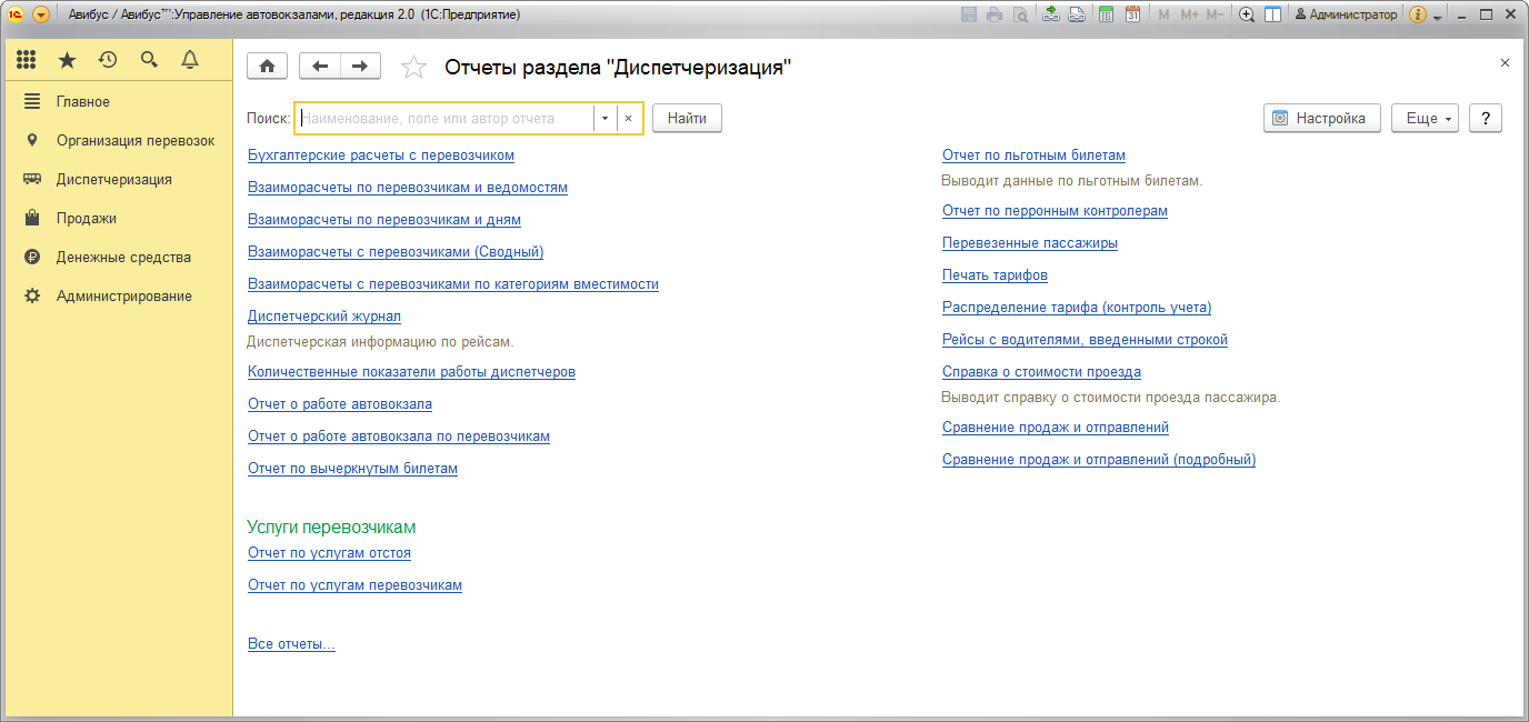 Для диспетчера доступны отчеты, позволяющие анализировать деятельность автовокзала, бухгалтерские расчеты и взаиморасчеты с перевозчиками, в том числе и по оказанным услугам, отчеты по услугам перевозчиков и т.д.: