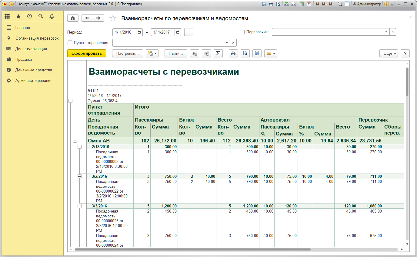 В отчете Взаиморасчеты по перевозчикам и дням отображается информация по стоимости тарифов, а также информация по вознаграждениям автовокзала в разрезе пунктов отправления и дат. Также в отчете отражается информация по предоставленным льготам.