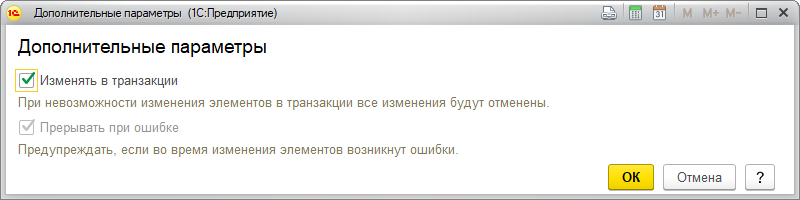 • Изменять в транзакции (по умолчанию флаг установлен) – программа позволяет обрабатывать выбранные для изменения элементы списка в транзакции. Если в процессе записи при установленном флаге не удается записать один из объектов (например, потому что объект редактируется другим пользователем), то будут отменены изменения во всех выбранных объектах.