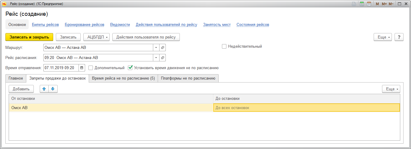Чтобы установить запрет на продажу билетов от/до определенных остановок рейсов перечислите их на вкладке Запреты продажи до остановок, подробнее – в разделе Остановки: