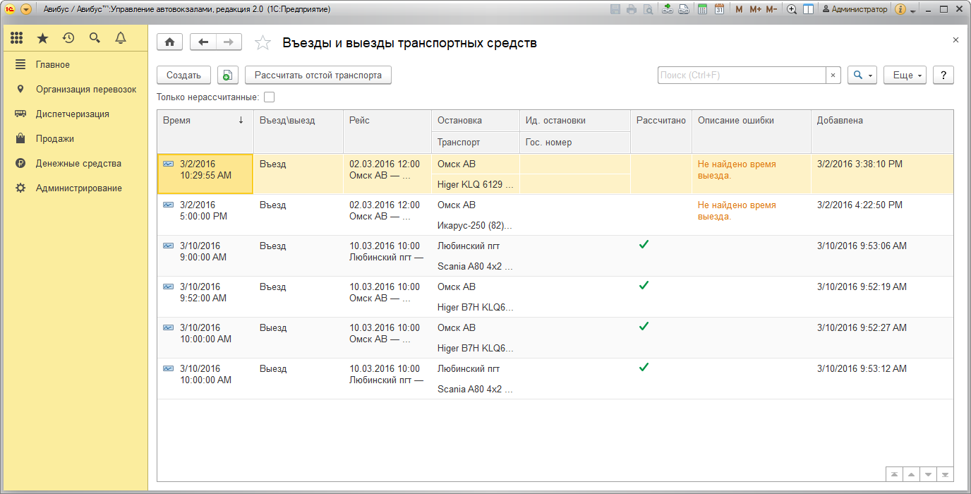 При регистрации прибытия/отправления через веб-сервис с помощью регламентного задания выполняется попытка сопоставить рейс и автобус по государственному номеру транспортного средства и идентификатору остановки, в случае если совпадения реквизитов не найдено, выходит сообщение об ошибке. Флаг Расчет выполнен устанавливается системой автоматически при выполненном расчете отстоя транспортного средства.