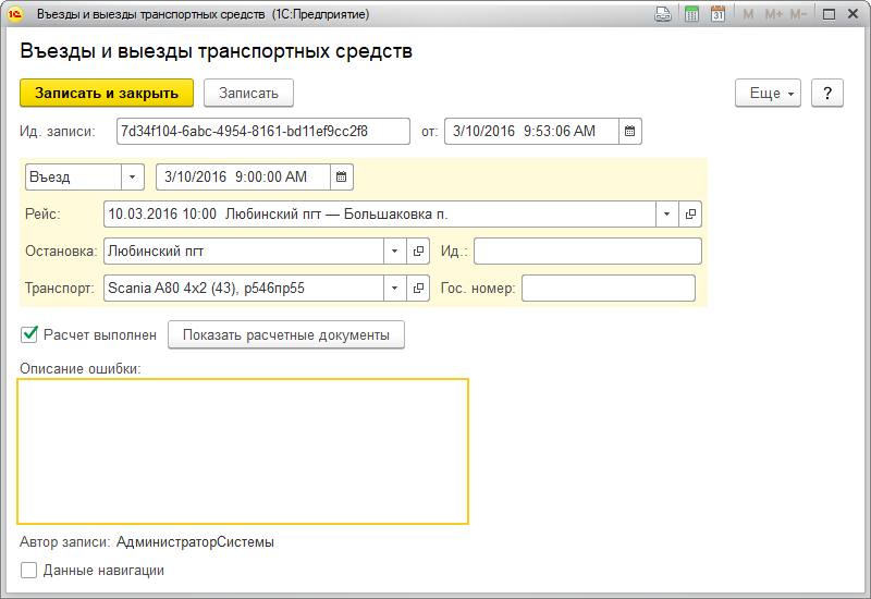 Каждой регистрации факта въезда/выезда транспортного средства присваивается идентификатор записи, дата документа заполняется автоматически: