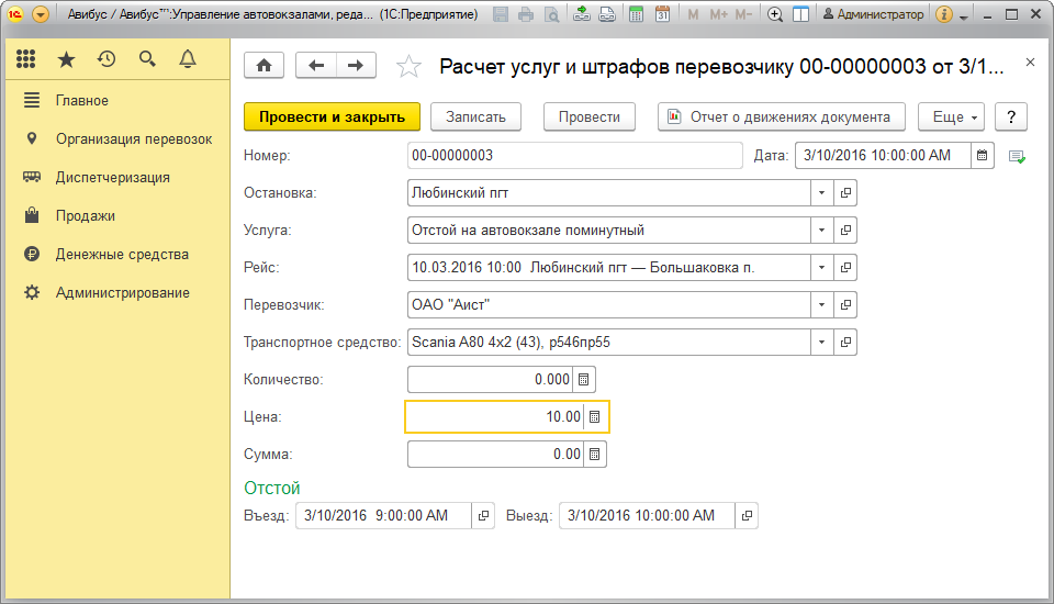 В расчете отражена основная информация по услуге/штрафу перевозчику: остановка, на которой предоставляется услуга , предоставляемая перевозчику, рейс, перевозчик, транспортное средство, количество, цена и сумма стоимости услуги, время отстоя: