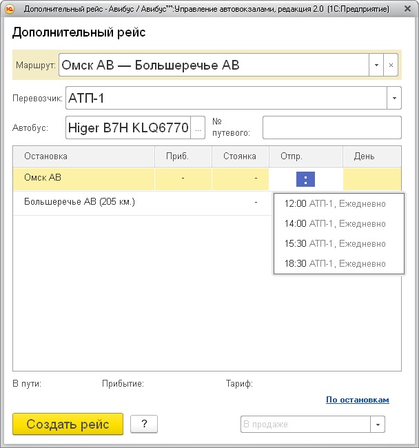 В рабочем месте диспетчера есть возможность создавать дополнительные рейсы по маршруту. Следует отметить, что они создаются с пунктом отправления, указанным в общем списке рейсов.