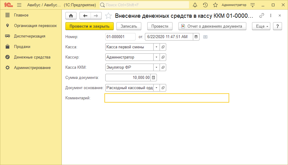 Данные о внесении денежных средств в кассу ККМ доступны для просмотра и редактирования в форме выбранного документа:
