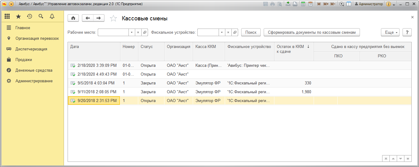 Кассовые смены создаются автоматически в рабочем месте кассира.