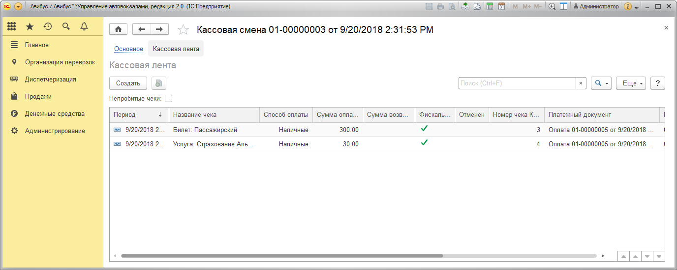 По ссылке командной панели Кассовая лента доступна информация о чеках, сформированных в текущую кассовую смену. Подробное описание кассовой ленты – в разделе Кассовая лента.