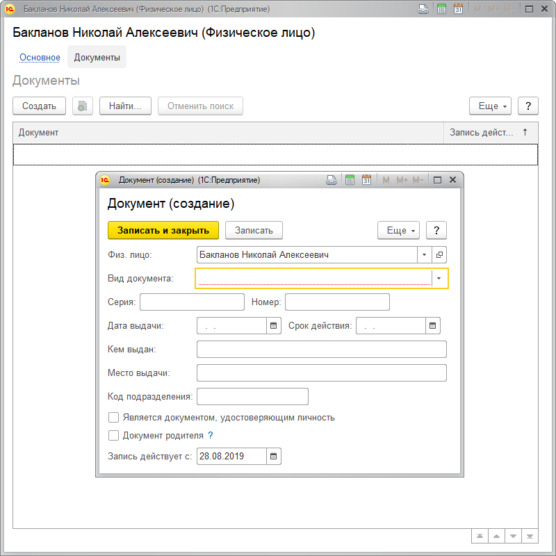 Физ. лицо – поле автоматически заполнено с указанием физического лица, для которого создается документ. Вид документа – из выпадающего списка выберите вид создаваемого документа. Укажите реквизиты документа: