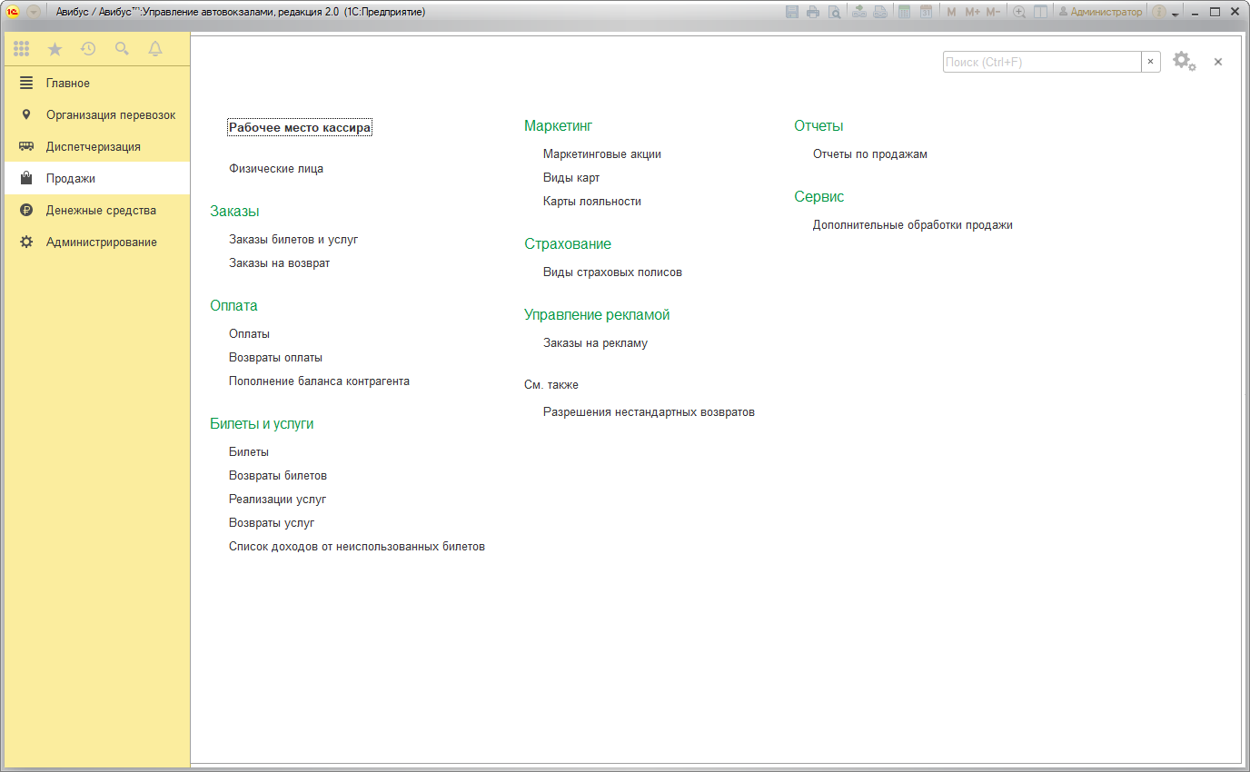 В разделе Продажи содержатся инструменты для осуществления продаж билетов и услуг, предоставления льгот и скидок в рамках маркетинговых акций, документы заказов и оплат, отчеты по продажам.