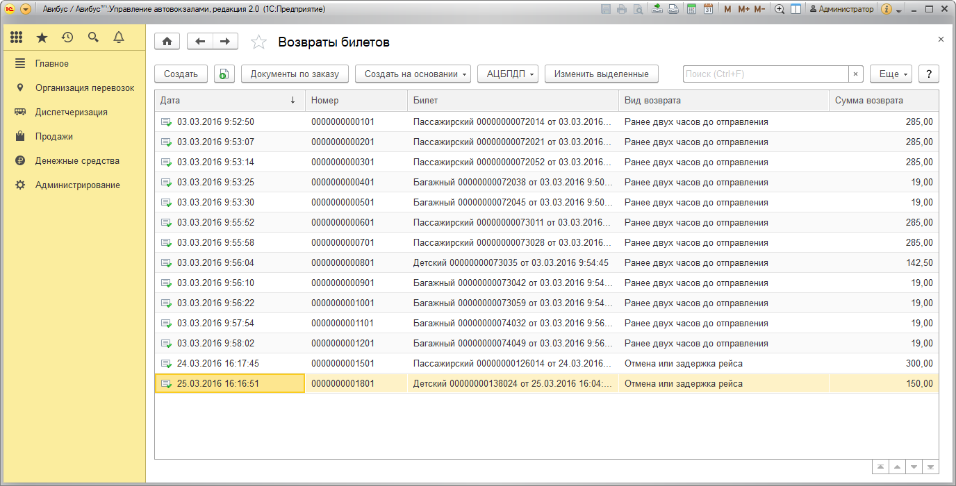 Журнал Список доходов от неиспользованных билетов содержит документы, в котором фиксируются доходы автовокзала от неиспользованных билетов.