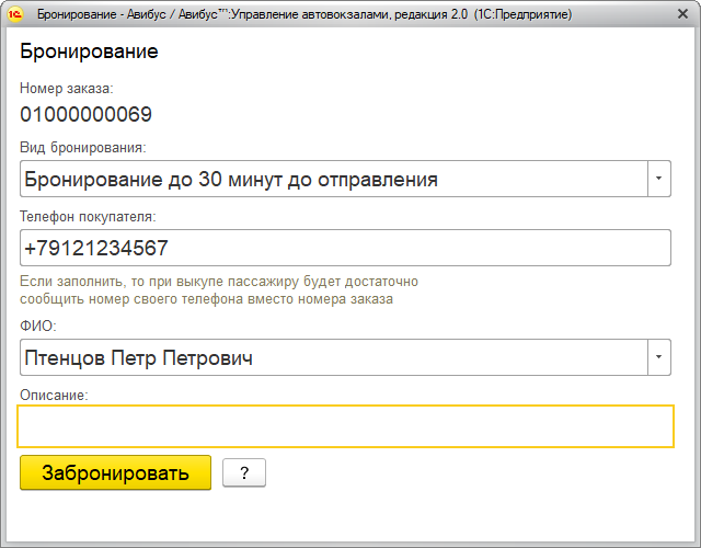 Любой указанный номер мобильного телефона приводится к единому формату: например, «912-123-45-67», «8(912)123 4567» и т.д. будут преобразованы в «79121234567». Таким образом, неважно, в каком виде кассир введет номер при поиске брони – заказ будет найден в любом случае.