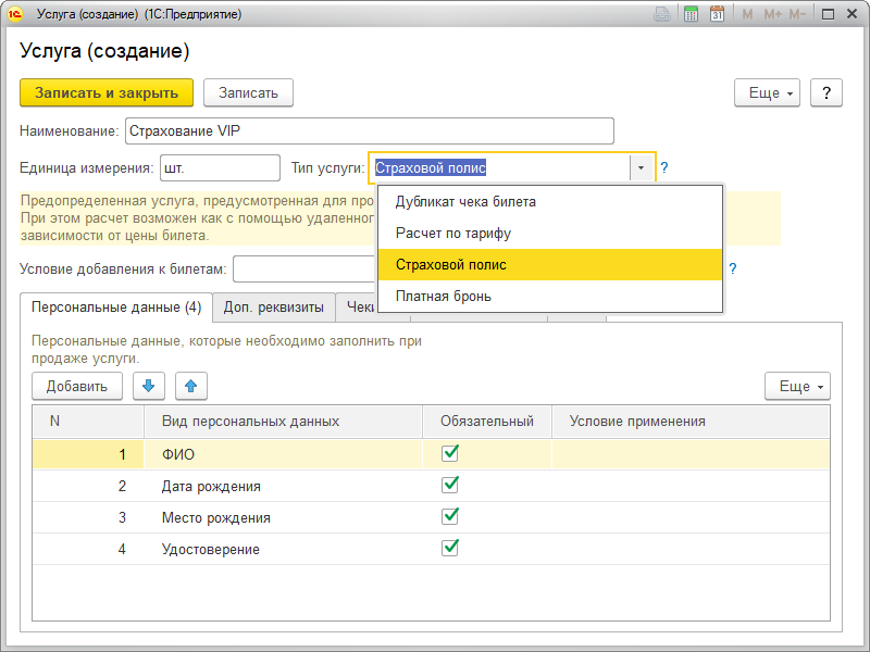 • Тип услуги : поле заполняется только в случае описания предопределенной в программе услуги. Существуют варианты: