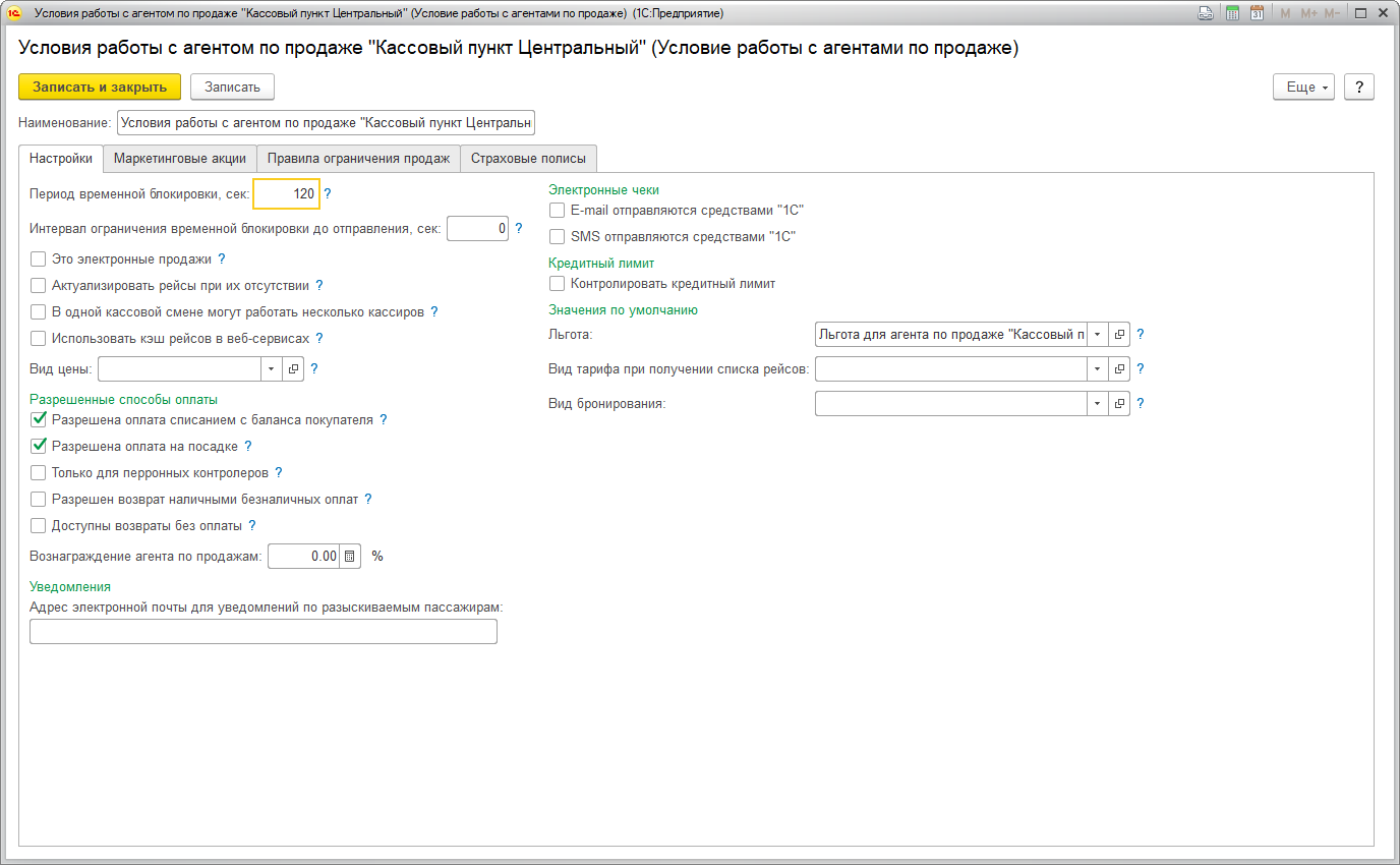 Период временной блокировки, сек. : определите, на сколько секунд после начала продажи заблокируется посадочное место, т.е. станет недоступно для продажи другим кассиром. Если кассир не успевает завершить продажу в указанный срок, он получит предложение Продолжить блокировку.