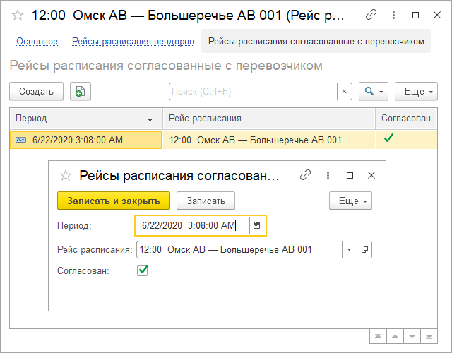 В одноименном разделе можно указать Рейсы расписания, согласованные с перевозчиком: