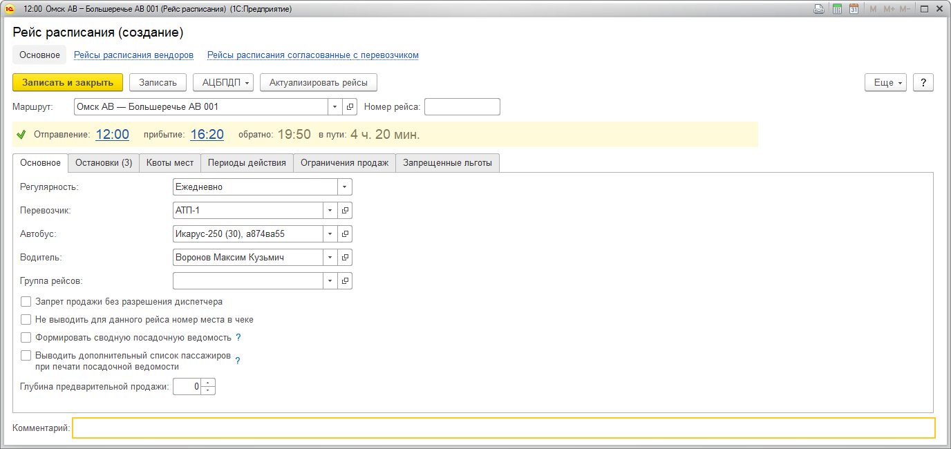 В открывшемся окне Рейс расписания (создание) выберите маршрут и заполните необходимую информацию: