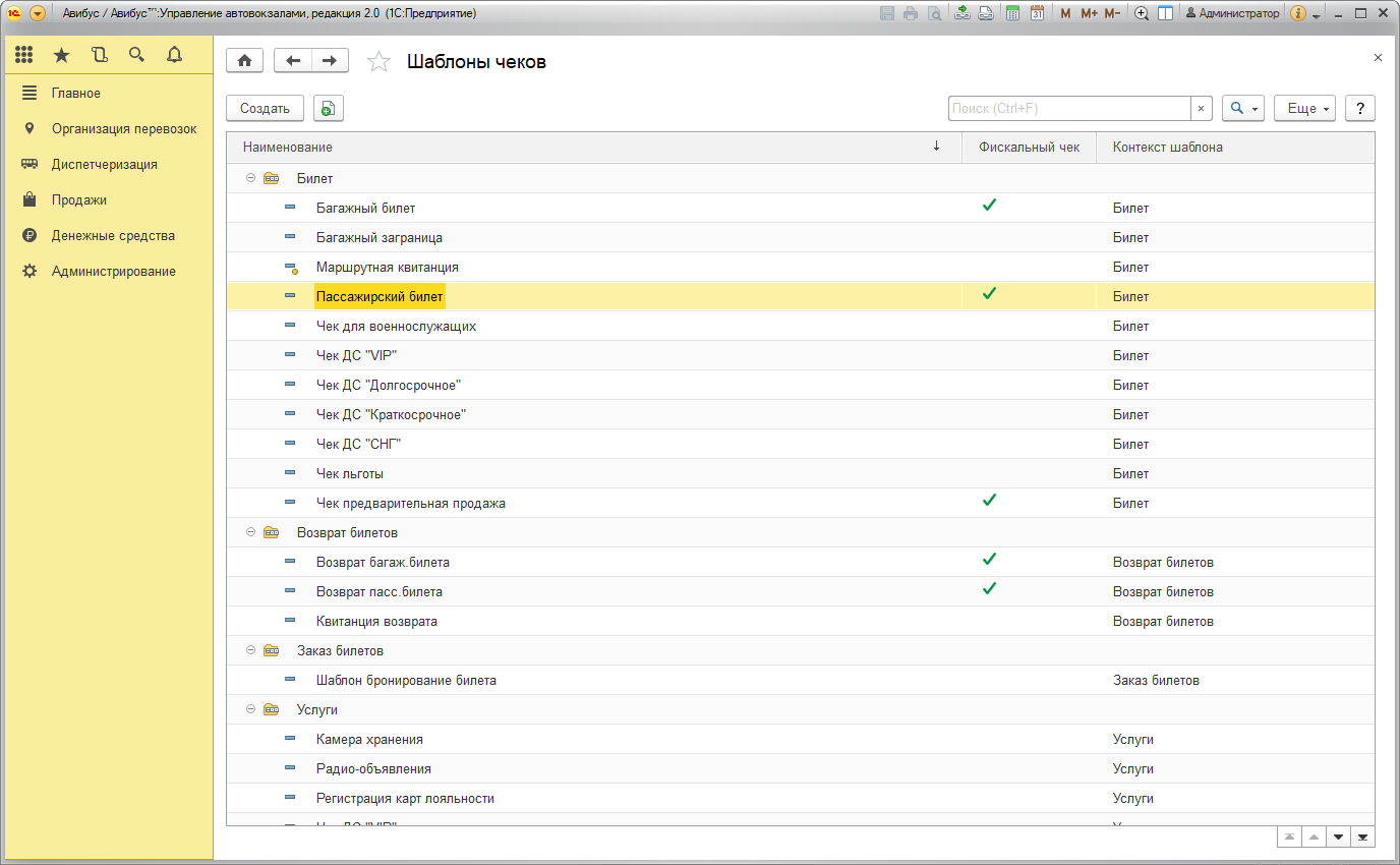 В программе предусмотрена возможность создавать различные шаблоны чеков и гибко настраивать их внешний вид и содержание. По умолчанию созданы шаблоны чеков для стандартных операций, в том числе шаблон маршрутной квитанции.