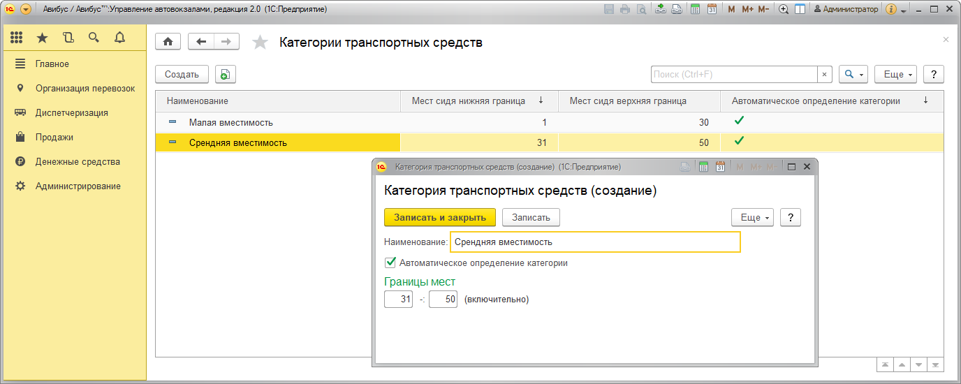 При установке флага Автоматическое определение категории , транспортному средству при создании будет автоматически присваиваться категория вместимости.