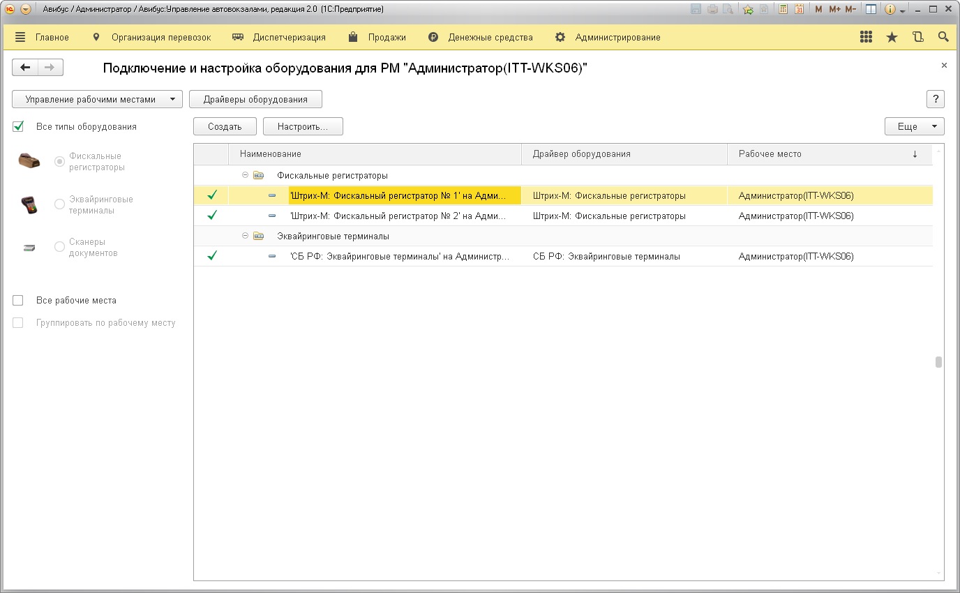 В этом разделе есть возможность настроить выбор подключаемого оборудования, если на одном рабочем месте используется несколько фискальных регистраторов в зависимости от условий: перевозчик и пункт отправления, например, если необходимо чтобы продажи для определенного перевозчика и пункта отправления фиксировались в указанной ККМ.