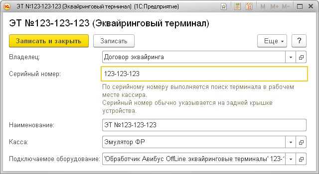После создания подключаемого оборудования необходимо создать запись о физическом экземпляре эквайрингового терминала. Для этого необходимо указать договор эквайринга, заполнить Серийный номер, который был указан в конфигурации рабочего места, указать кассу ККМ и выбрать конфигурацию рабочего места с установленным драйвером «Обработчик Авибус OffLine эквайринговые терминалы».
