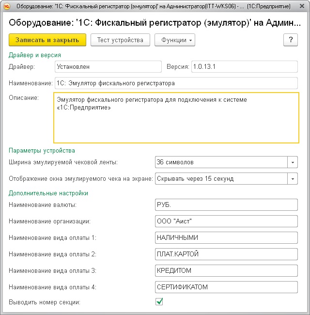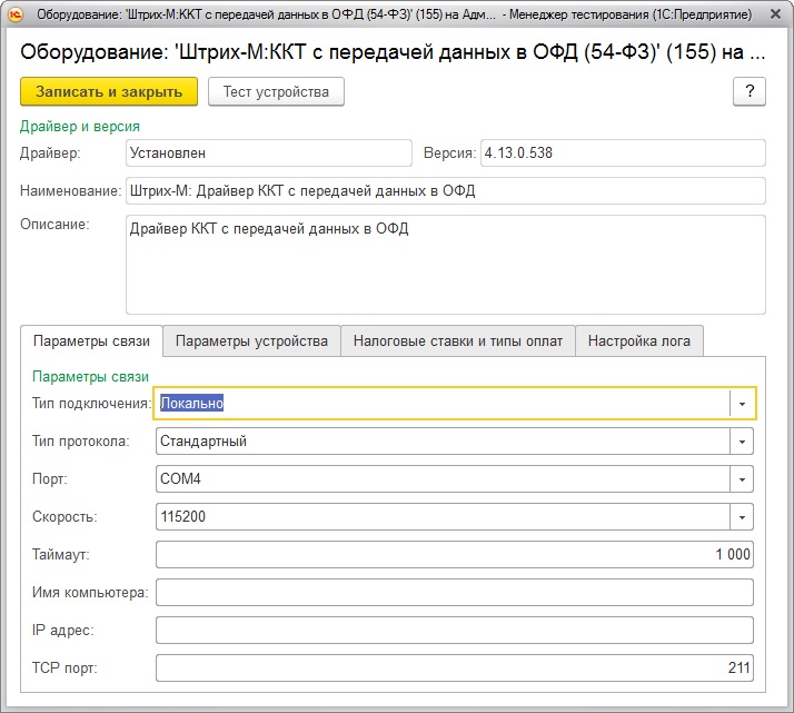 Все поля обязательны к заполнению. Серийный номер для ККТ от компании «Штрих» указываем без лидирующих нулей, например, вместо серийного номера «0000000155» нужно указать «155». Этот же номер желательно указать в наименовании, что позволит легко искать оборудование в списке. В результате получим следующие настройки: