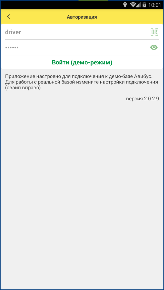 Для начала работы необходимо авторизоваться в приложении. Авторизацию можно пройти вручную, вводя логин и пароль пользователя, зарегистрированного в системе «Авибус», либо при помощи QR-кода, который может выдать администратор системы: