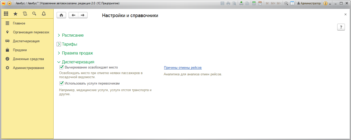 В этом разделе производятся первоначальные настройки диспетчеризации.