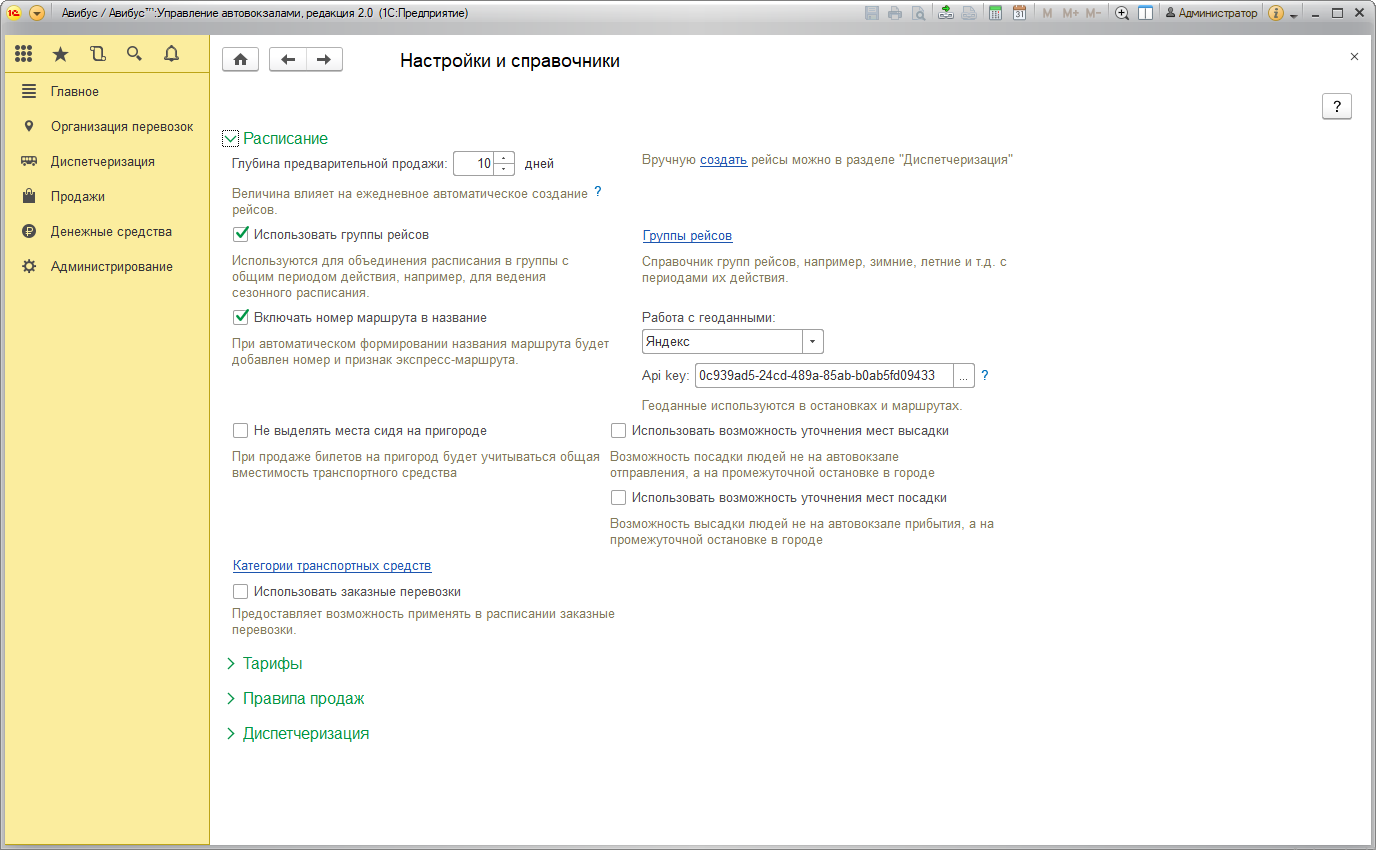 Установленные флаги Использовать возможность уточнения мест высадки и Использовать возможность уточнения мест посадки позволяют определять пунктом высадки/посадки пассажиров промежуточную остановку в городе, а не только автовокзал прибытия/отправления соответственно.