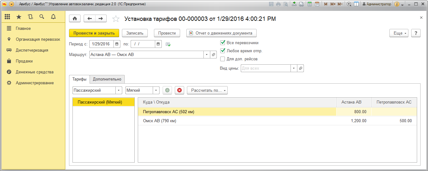 Необходимо указать стоимость тарифа для билетов со всеми возможными пунктами отправления и прибытия по маршруту для использования этой информации в справочной системе или для учета проданных билетов на неавтоматизированных автовокзалах.