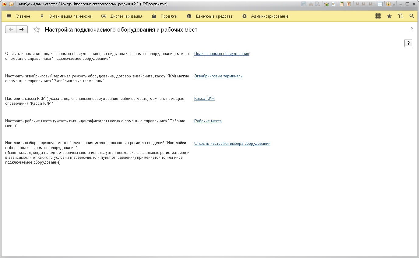 В справочнике Подключаемое оборудование создаются конфигурации рабочих мест. Запись в справочнике связывает конкретное рабочее место (пользователь, компьютер), конфигурацию оборудования и физический экземпляр оборудования, при этом один и тот же экземпляр, рабочее место, пользователь могут использоваться в нескольких записях.