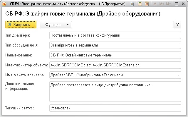 В открывшейся форме необходимо выбрать драйвер эквайрингового терминала Сбербанка РФ.