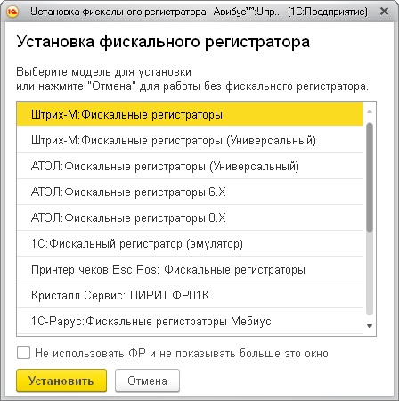В открывшейся форме необходимо выбрать пункт 1С:Фискальный регистратор (Эмулятор) и нажать на кнопку Установить.