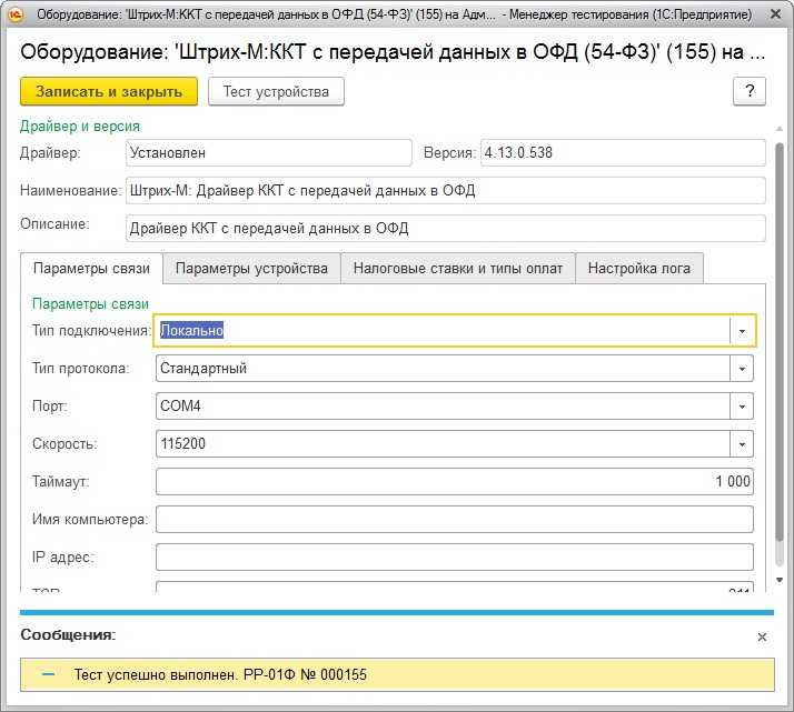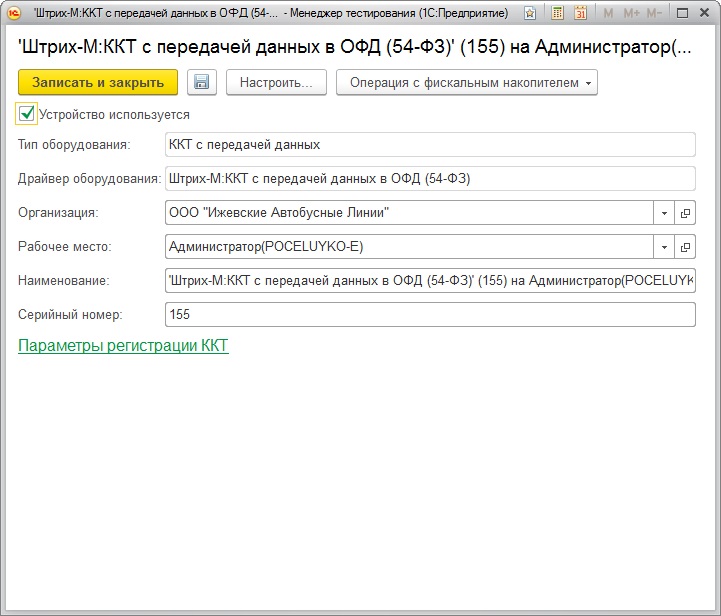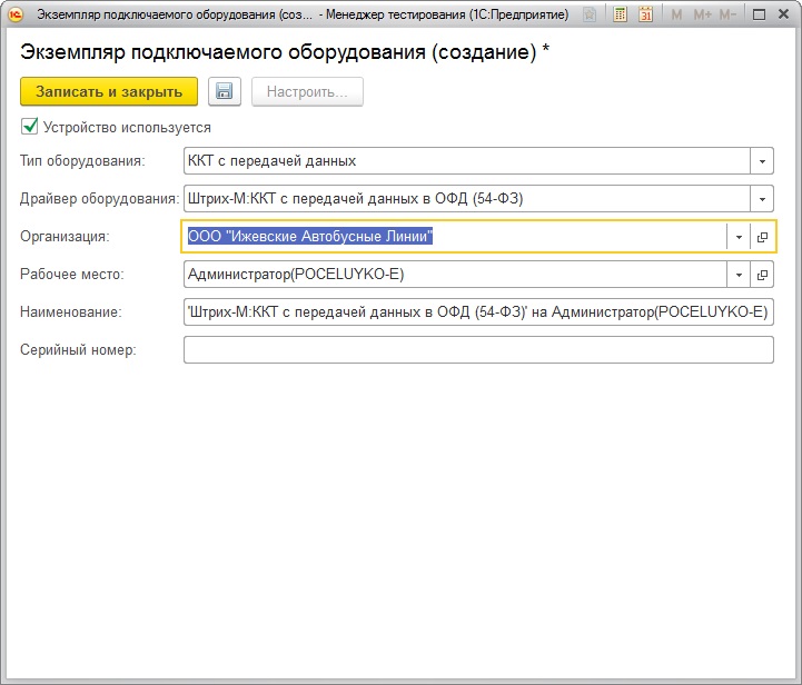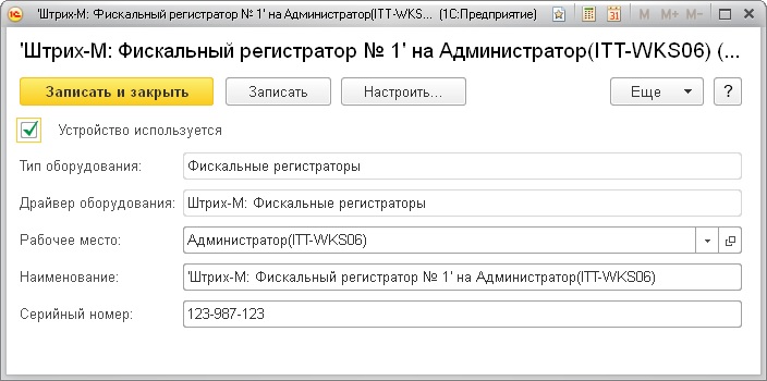 Все поля обязательны к заполнению. Серийный номер для ККТ от компании «Штрих» указываем без лидирующих нулей, например, вместо серийного номера «0000000155» нужно указать «155». Этот же номер желательно указать в наименовании, что позволит легко искать оборудование в списке. В результате получим следующие настройки: