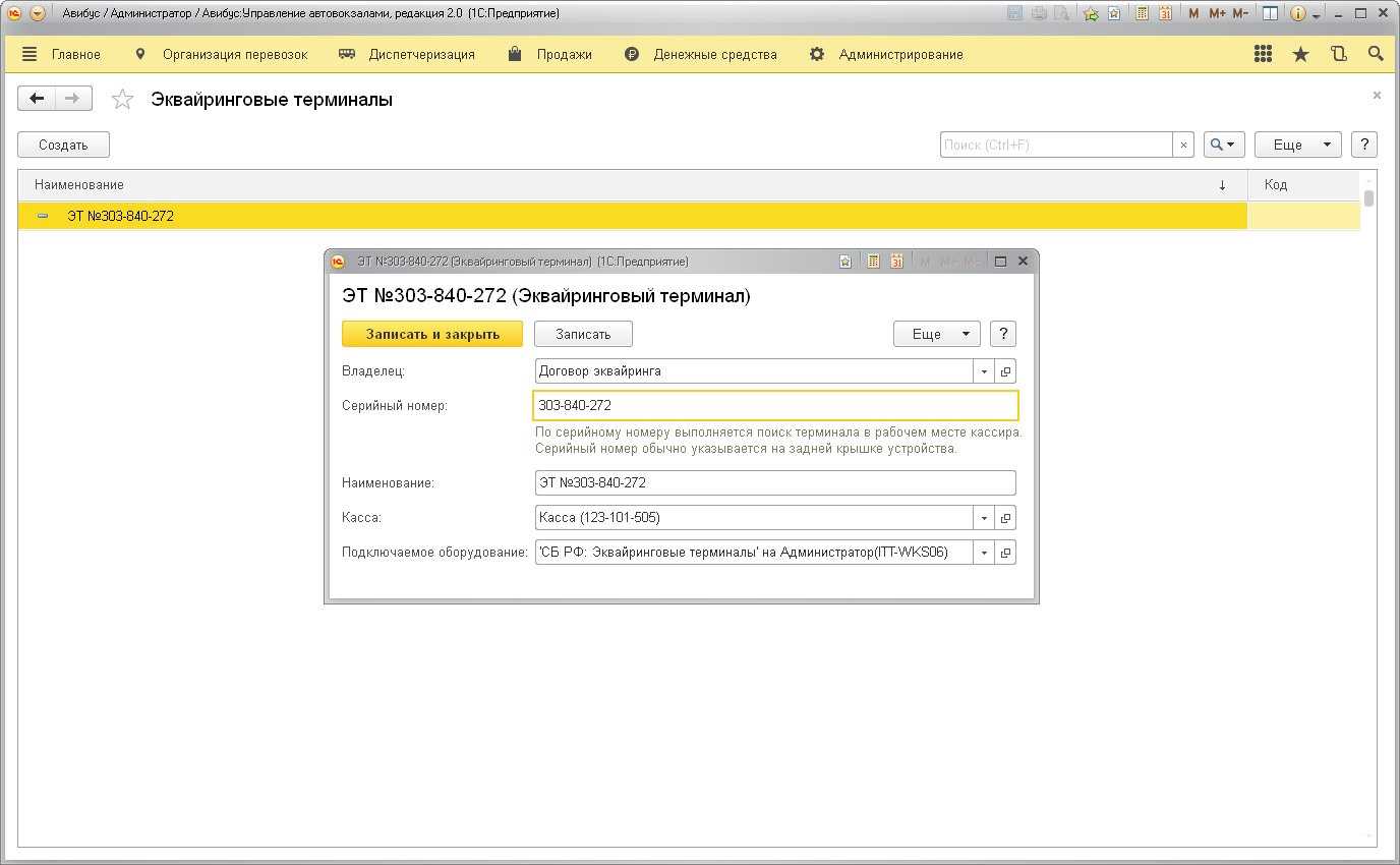 После создания подключаемого оборудования необходимо создать запись о физическом экземпляре эквайрингового терминала. Для этого необходимо указать договор эквайринга, заполнить Серийный номер, который был указан в конфигурации рабочего места, указать кассу ККМ и выбрать конфигурацию рабочего места с установленным драйвером «Обработчик Авибус OffLine эквайринговые терминалы».