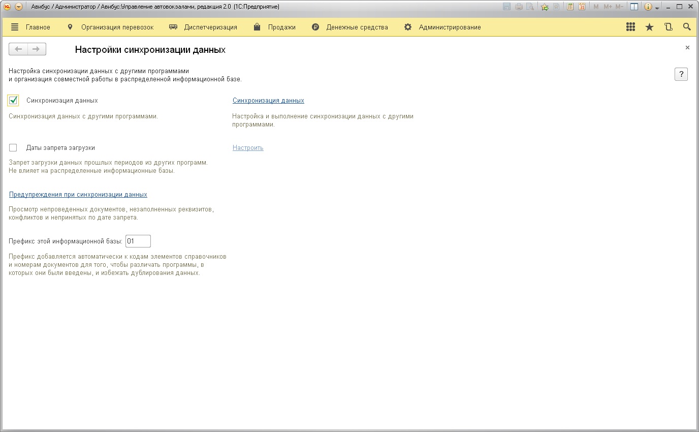 Для того чтобы использовать в программе возможности синхронизации данных, необходимо включить настройку Синхронизация данных в разделе Администрирование – Настройки синхронизации данных.