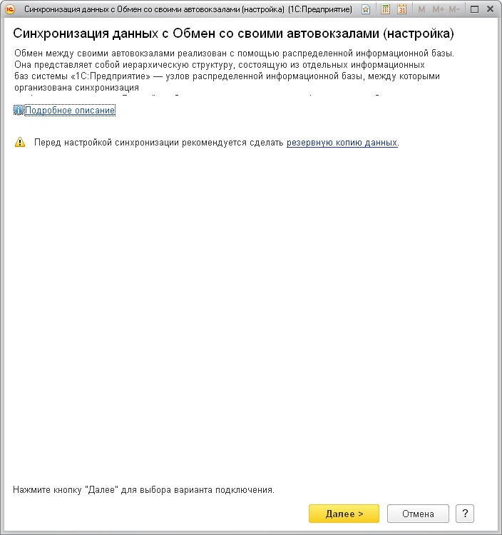 После выбора варианта подключения необходимо нажать кнопку Далее для перехода к настройке параметров синхронизации данных.