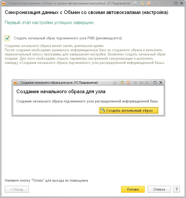 На завершающем шаге помощника рекомендуется установить флаг Создать начальный образ подчиненного узла РИБ.
