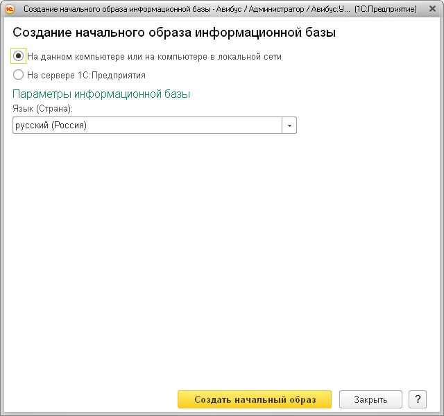 Для создания начального образа на данном компьютере или на компьютере в локальной сети задаются Параметры информационной базы – Язык (Страна). По умолчанию предлагаются те параметры, которые были заданы при создании синхронизации данных.