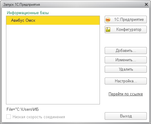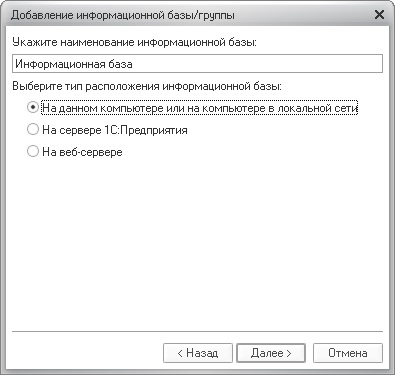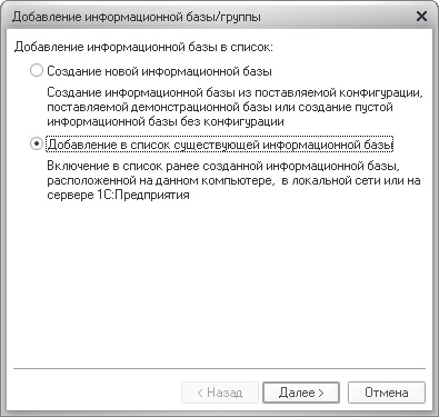 Далее необходимо запустить 1С:Предприятие, нажать кнопку Добавить, выбрать пункт Добавление в список существующей информационной базы и, после указания названия базы, выбрать тип расположения ИБ.
