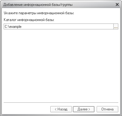 С помощью кнопки в виде многоточия, необходимо указать путь к новой папке, в которую был помещен файл с начальным образом подчиненного узла распределенной информационной базы и нажать на кнопку Далее. Указанная информационная база будет добавлена в список баз.