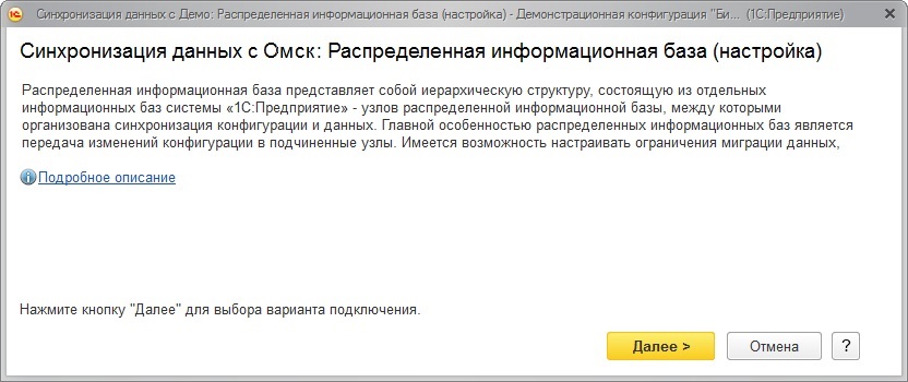 В списке Синхронизация данных необходимо нажать кнопку Настроить синхронизацию данных. Из предложенного списка настроек выбирается значение Распределенная информационная база. Далее необходимо следовать указаниям программы.