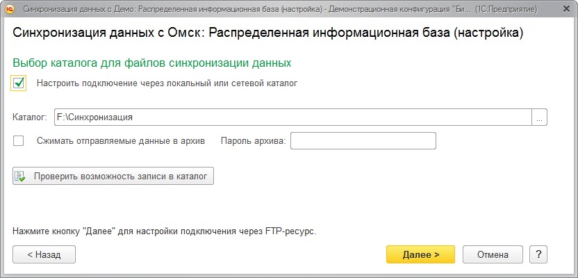 Для проверки указанных параметров синхронизации данных необходимо нажать на кнопку Далее.